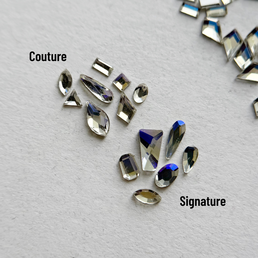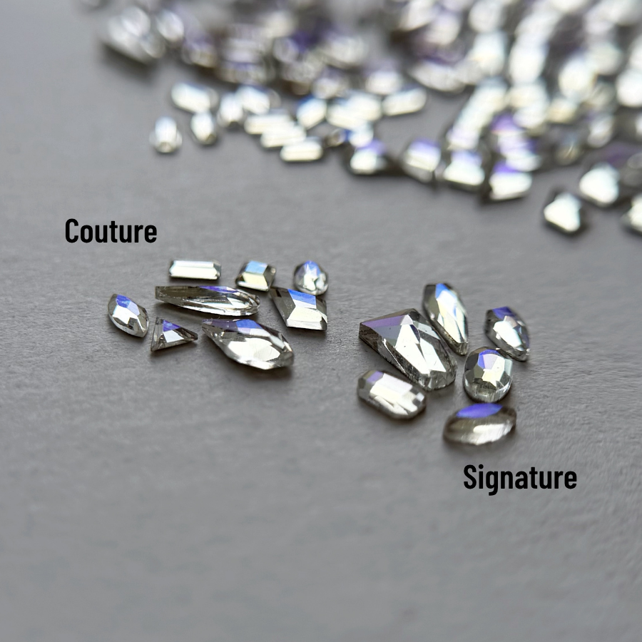Les diamants Couture se distinguent par une taille plus précise et des pointes plus définies, offrant un rendu fin et sophistiqué. Leur base légèrement surélevée crée des facettes supplémentaires, ce qui augmente la réflexion de la lumière et donne un éclat plus intense.