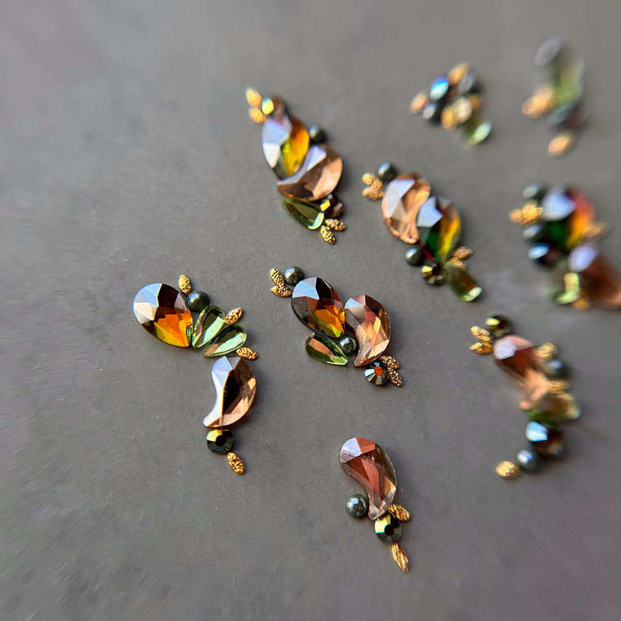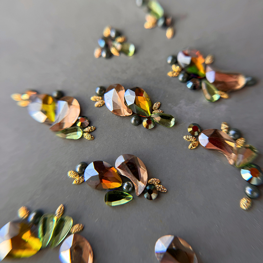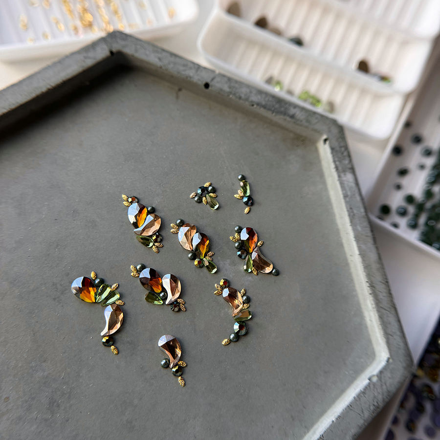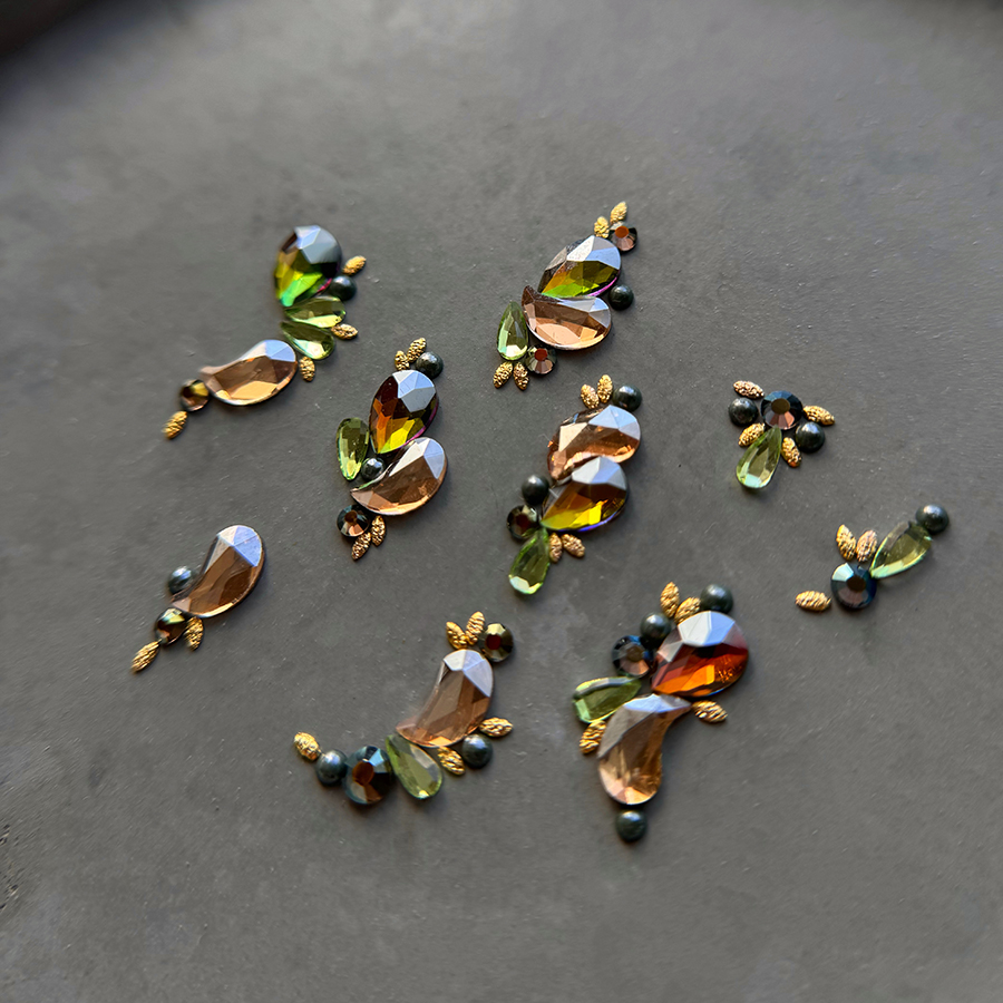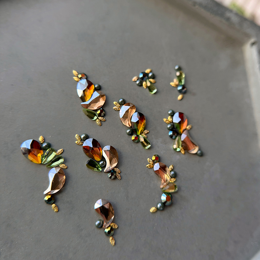 Inspiré des profondeurs de la forêt en automne, cet ensemble marie des cristaux bruns, verts et dorés rappelant les feuilles tombantes et la nature en transformation. Leur éclat riche et chaleureux ajoute une touche de luxe naturel à tes ongles, tout en évoquant l’ambiance magique d’octobre.