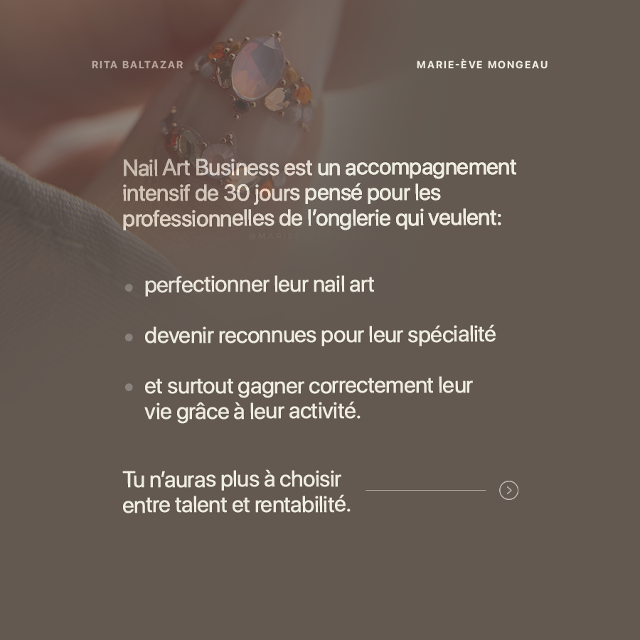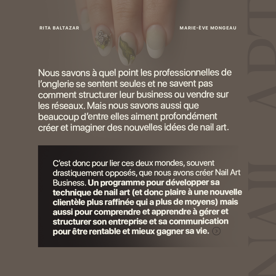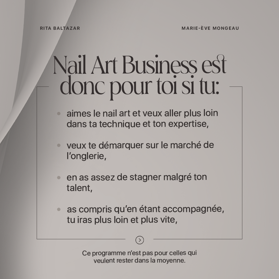 LA PROMESSE Nail Art Business est un programme d’accompagnement intensif conçu pour les professionnelles de l’onglerie qui refusent de choisir entre talent créatif et rentabilité. Ici, tu ne fais pas “juste” du nail art. Tu construis une expertise reconnue, une posture professionnelle solide et un business capable de te faire bien vivre.